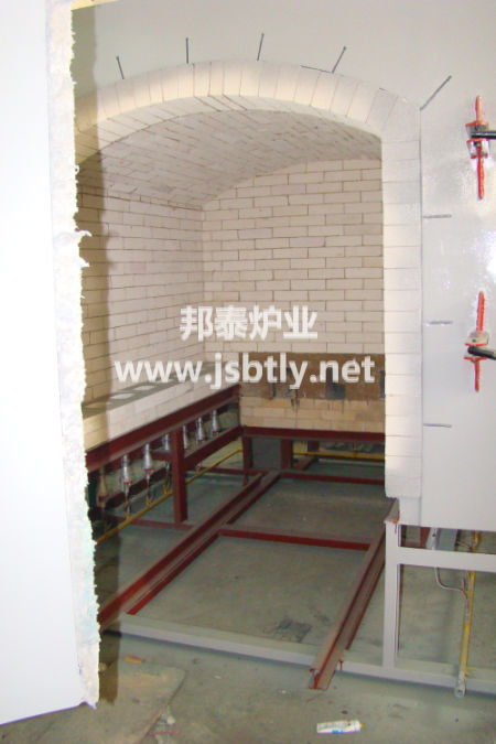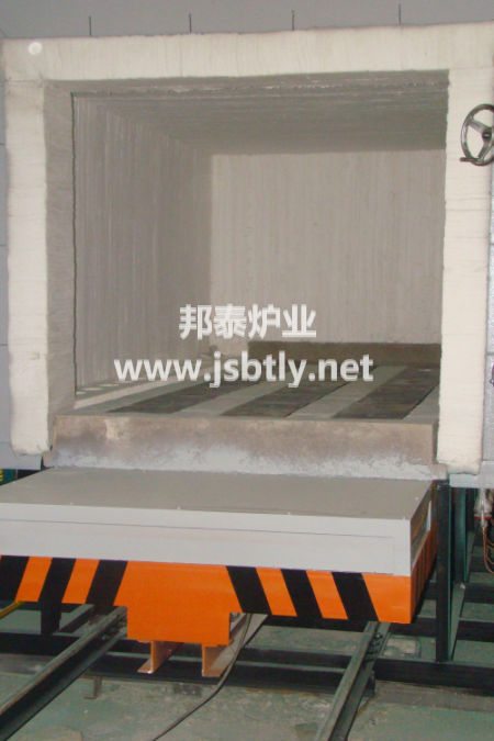 3、台车骨架由各种大型工字钢、槽钢、角钢及厚钢板等组合焊接而成。台车传动采用电动机、蜗轮减速机组合通过链条带动前端主动轮传动。台车耐火砌体采用高铝定型砖结构,与炉体密封效果好,耐压强度高。台车与炉体密封采用软接触的方法,并在台车下部设有迷宫式沙封槽及沙封刀密封装置。